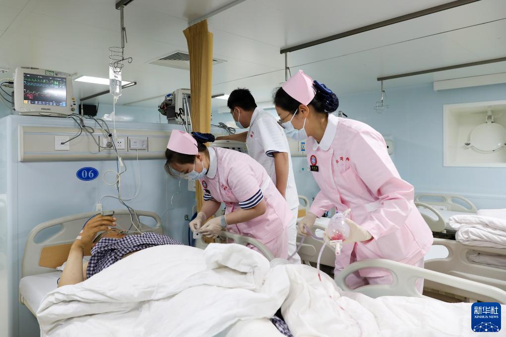 7月14日,中国海军“和平方舟”号医院船医护人员对重伤渔民进行术后监护。新华社发(张凌 摄)