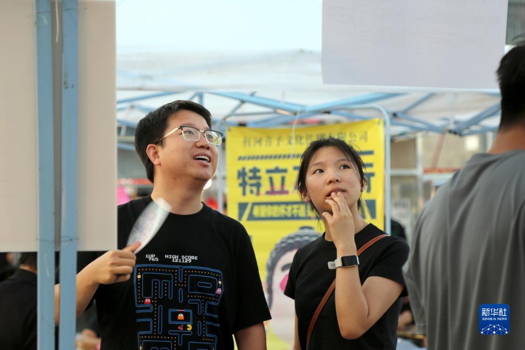 7月15日晚,求职者在云南省红河哈尼族彝族自治州蒙自市大树寨的“青年人才夜市”招聘会现场查看岗位信息。新华社发(薛莹莹 摄)