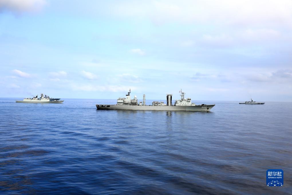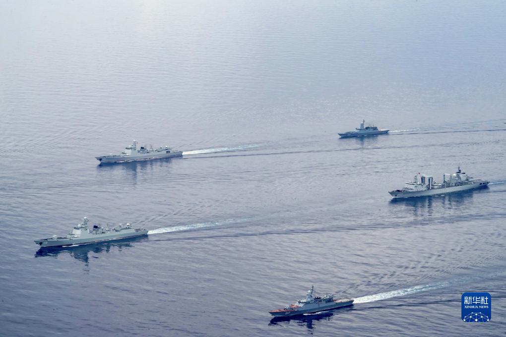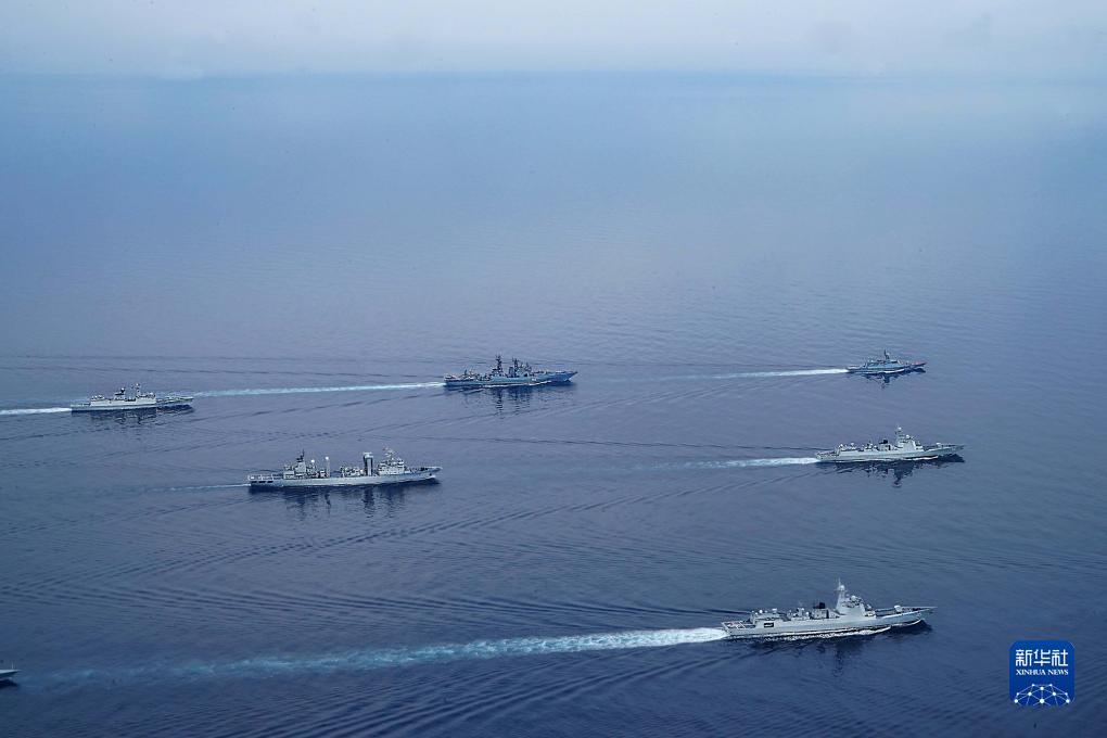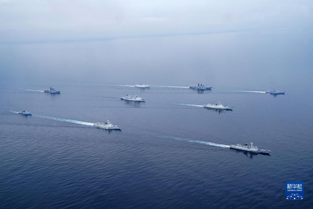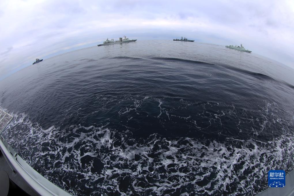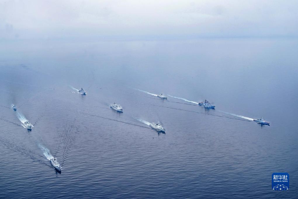 7月20日,在日本海某海域进行的“北部·联合-2023”演习中,中俄双方舰艇编队航行。新华社发(张海龙 摄)