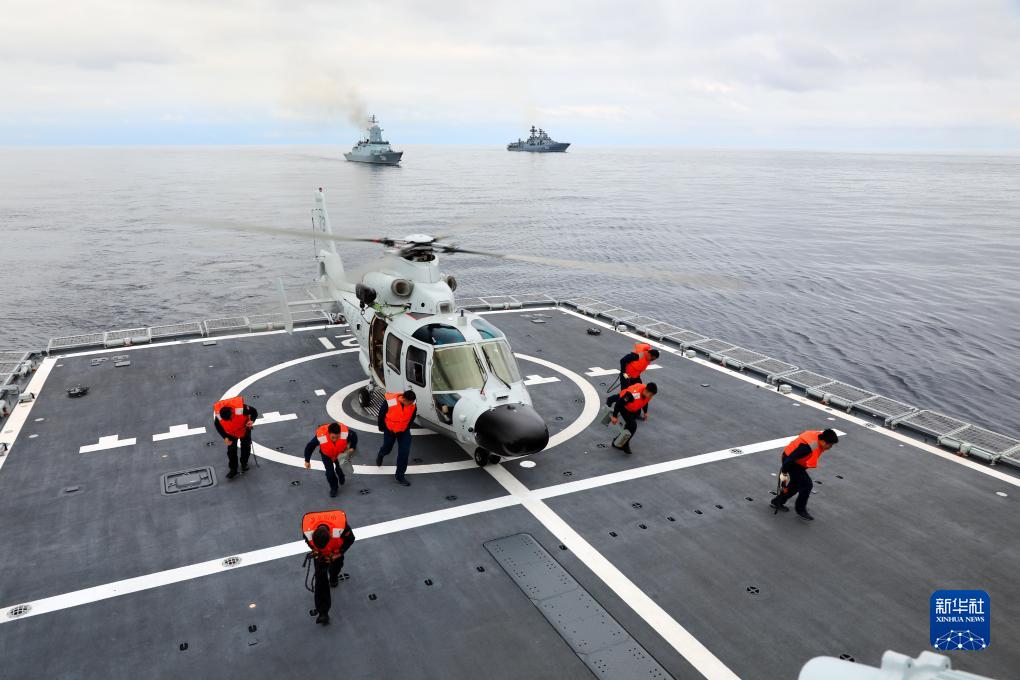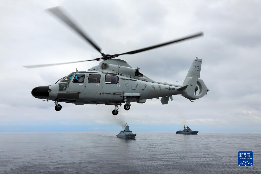 7月20日,在日本海某海域进行的“北部·联合-2023”演习中,中国海军齐齐哈尔舰舰载直升机起飞警戒。新华社发(张海龙 摄)