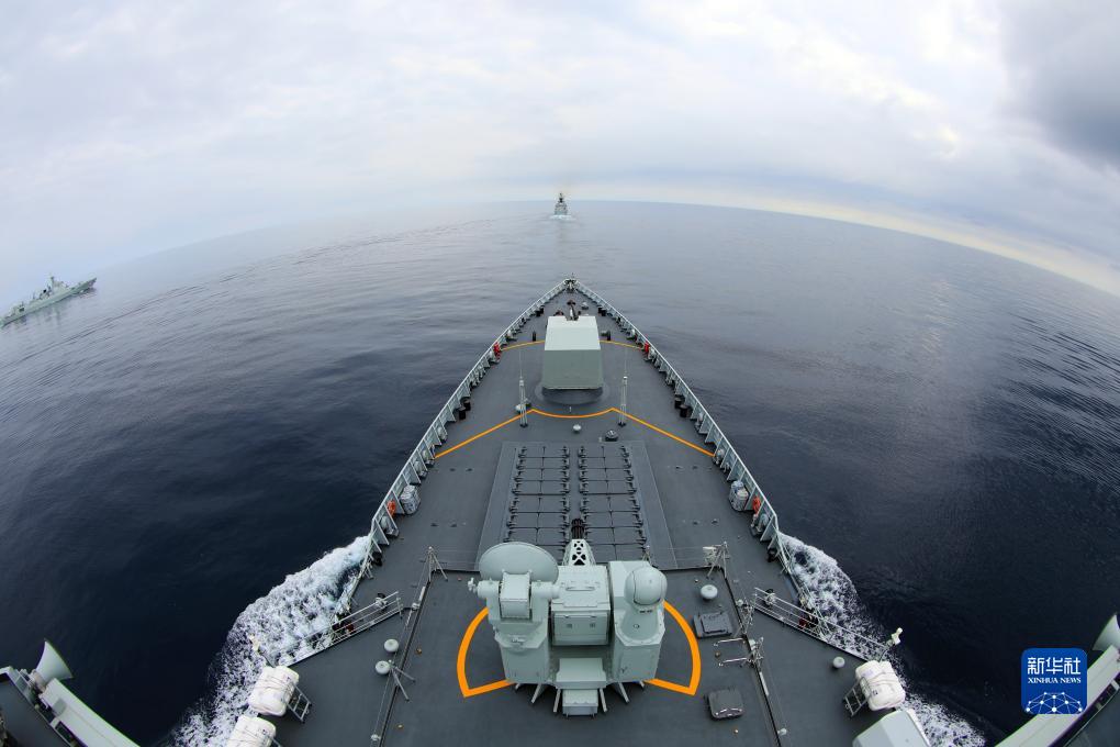 7月20日,在日本海某海域进行的“北部·联合-2023”演习中,中方海上作战群指挥舰齐齐哈尔舰破浪前行。新华社发(张海龙 摄)