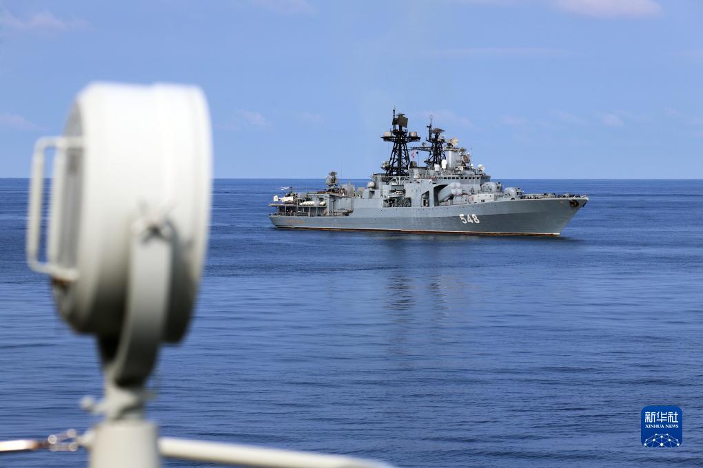 7月20日,在日本海某海域进行的“北部·联合-2023”演习中,俄罗斯“潘捷列耶夫海军上将”号大型反潜舰与中方舰艇编队航行。新华社发(张海龙 摄)