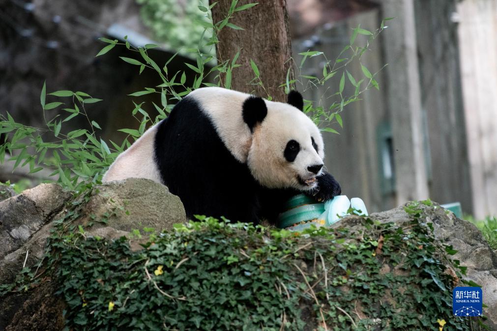 7月22日,在美国华盛顿史密森学会国家动物园,大熊猫“美香”享用生日蛋糕。新华社发(史密森学会国家动物园供图)
