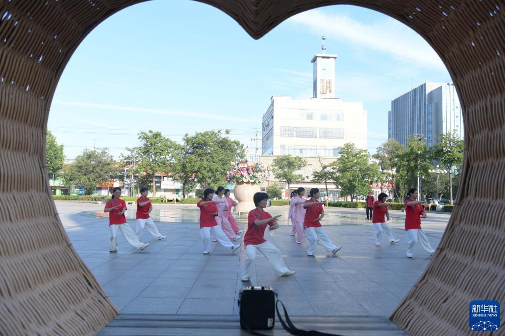 8月8日,山东省临沂市临沭县文化广场太极团队在文化广场展示太极拳。新华社发(王文杰 摄)