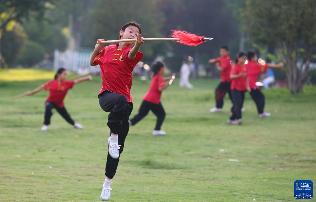 8月8日,在山东省滕州市市民公园,孩子们在练习武术。新华社发(李志军摄)