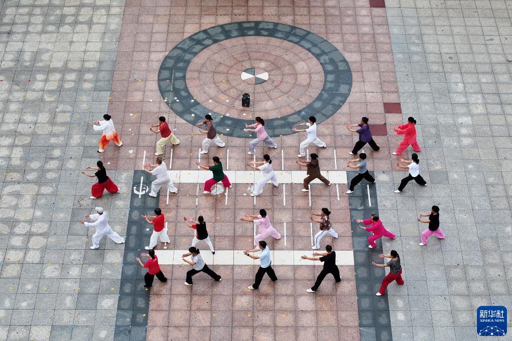 8月8日,湖南省衡阳市衡东县文体广场,太极拳爱好者在晨练(无人机照片)。新华社发 (肖亚辉摄)