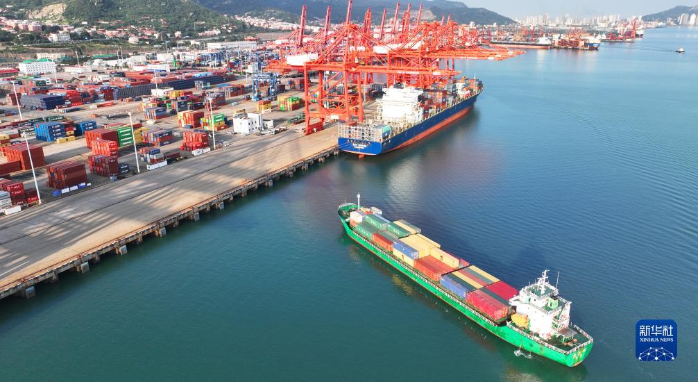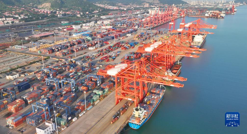 8月8日,在江苏连云港港,货轮在进行装卸作业(无人机照片)。新华社发(耿玉和 摄)