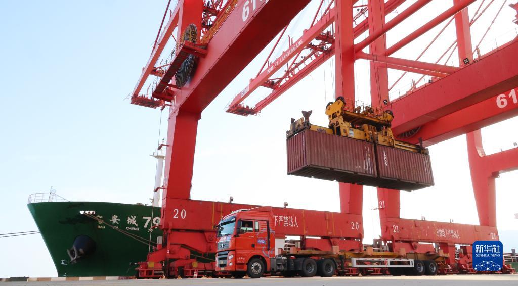 8月8日,在江苏连云港港,货轮在进行装卸作业。新华社发(耿玉和 摄)
