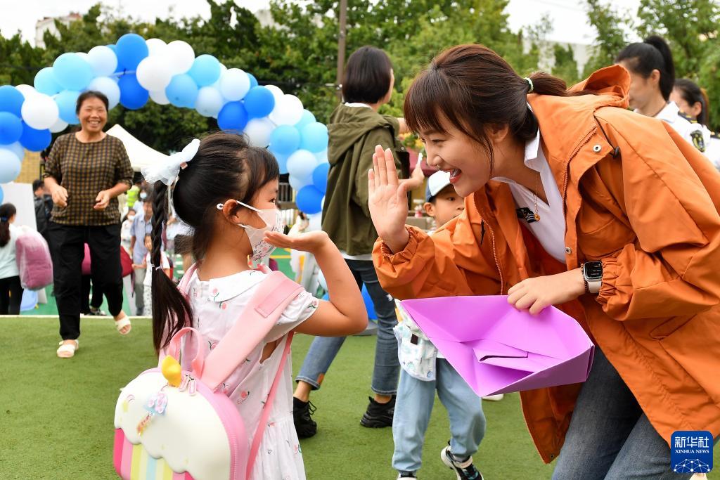 8月28日,在山东省青岛市市南区金钥匙幼儿园新学期开学迎接仪式上,一名小朋友与老师击掌致意。新华社发(王海滨摄)