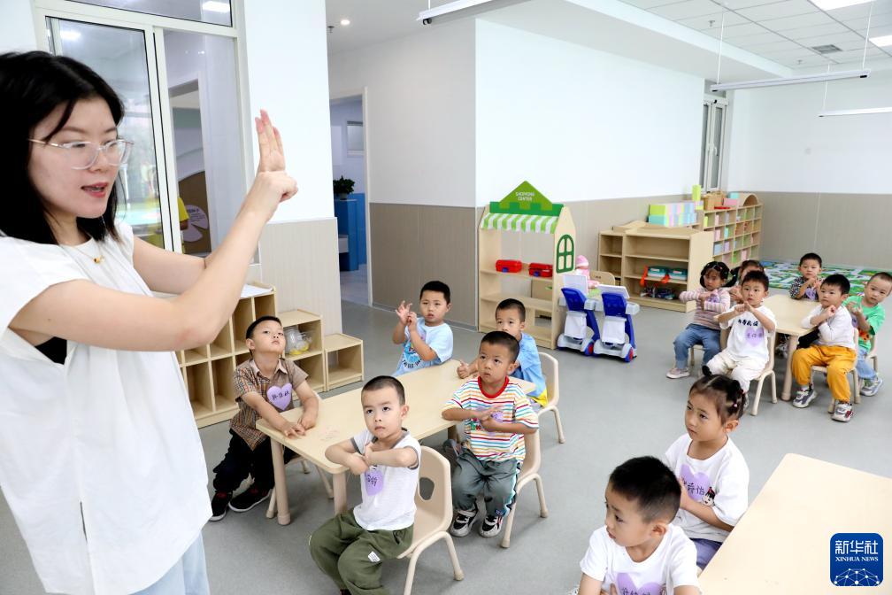 8月28日,在山东省青岛西海岸新区金河路幼儿园,老师在开学第一课中为幼儿讲解“七步洗手法”。新华社发(王培珂摄)
