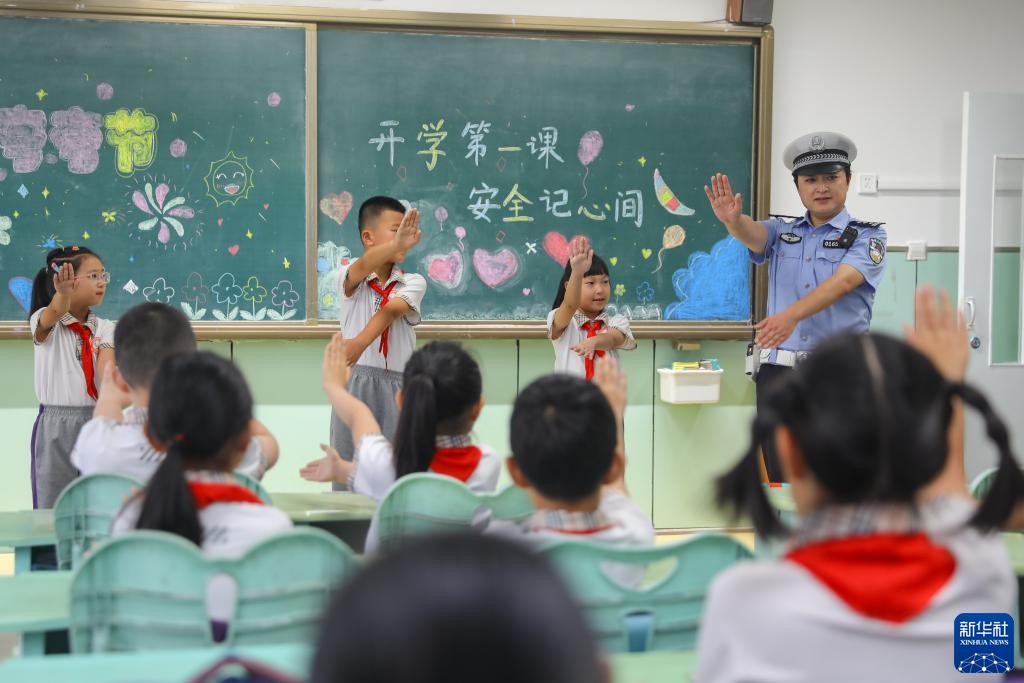 8月28日,在山东省青岛市李沧区虎山路小学,交警在开学第一课中指导小学生学习交通手势。新华社发(张鹰摄)