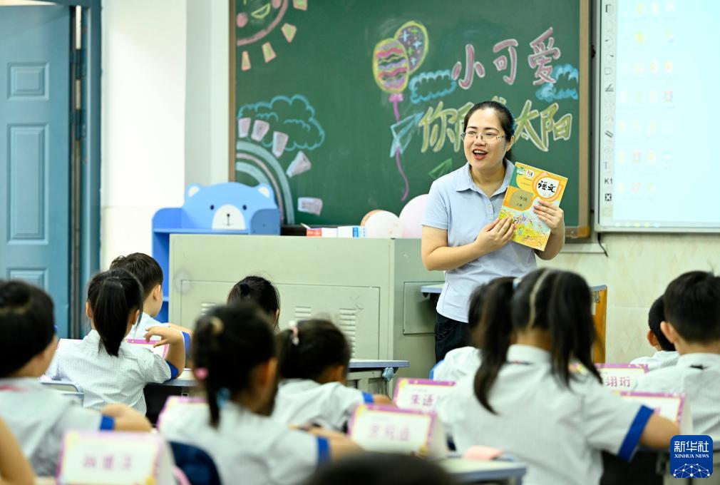 8月28日,广西柳州市德润小学一年级教师向新生讲解小学课本。新华社发(黎寒池摄)