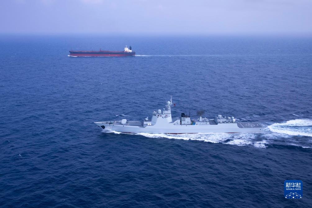在亚丁湾、索马里海域执行护航任务期间,中国海军第43批护航编队为商船实施伴随护航(3月9日摄)。新华社发(吴亢慈 摄)