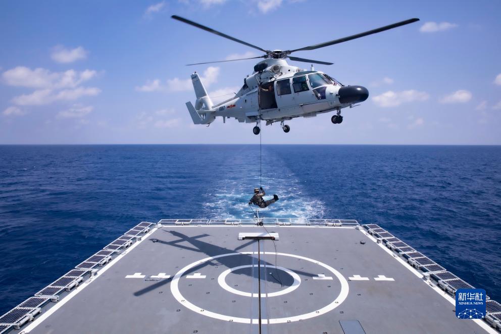 中国海军第43批护航编队在任务间隙组织特战队员进行直升机索降训练(4月12日摄)。新华社发(吴亢慈 摄)