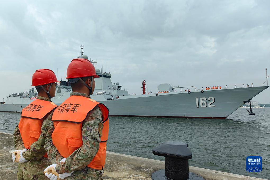 中国海军第43批护航编队圆满完成亚丁湾、索马里海域护航和撤离我在苏丹人员等任务后,返回广东湛江某军港(8月29日摄)。新华社发(杨捷 摄)