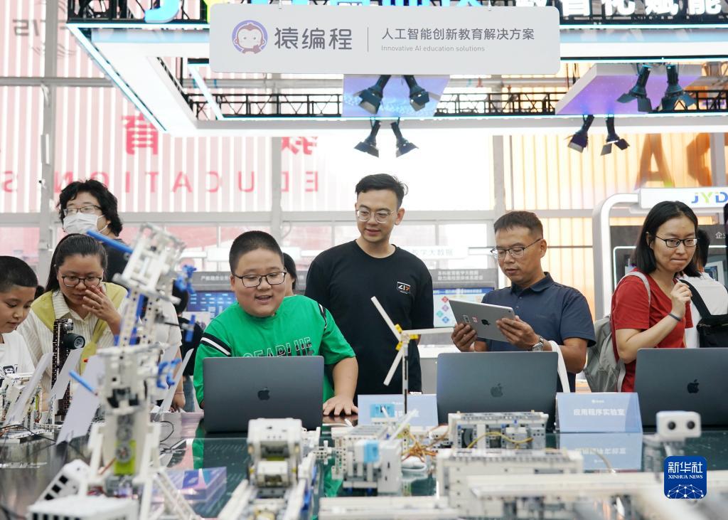 9月3日,在首钢园教育服务专题展区,小朋友在体验智能硬件编程作品。新华社记者 张晨霖 摄