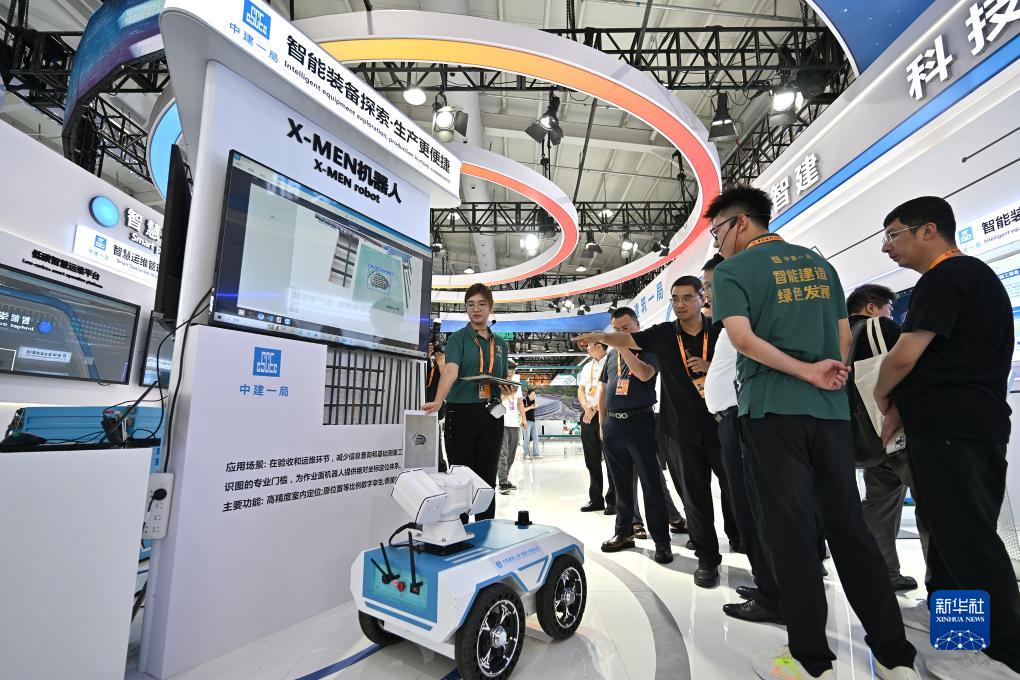 9月3日,参观者在首钢园中建一局展台了解一款基于高精度室内定位的施工检测与运维改造辅助机器人。新华社记者 李鑫 摄