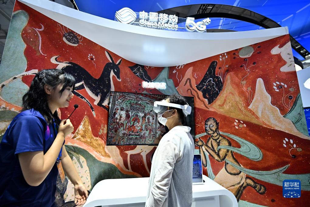 9月3日,一名参观者在首钢园中国移动展台体验基于AR/VR特效的敦煌导览,沉浸式感受敦煌壁画的魅力。新华社记者 李鑫 摄