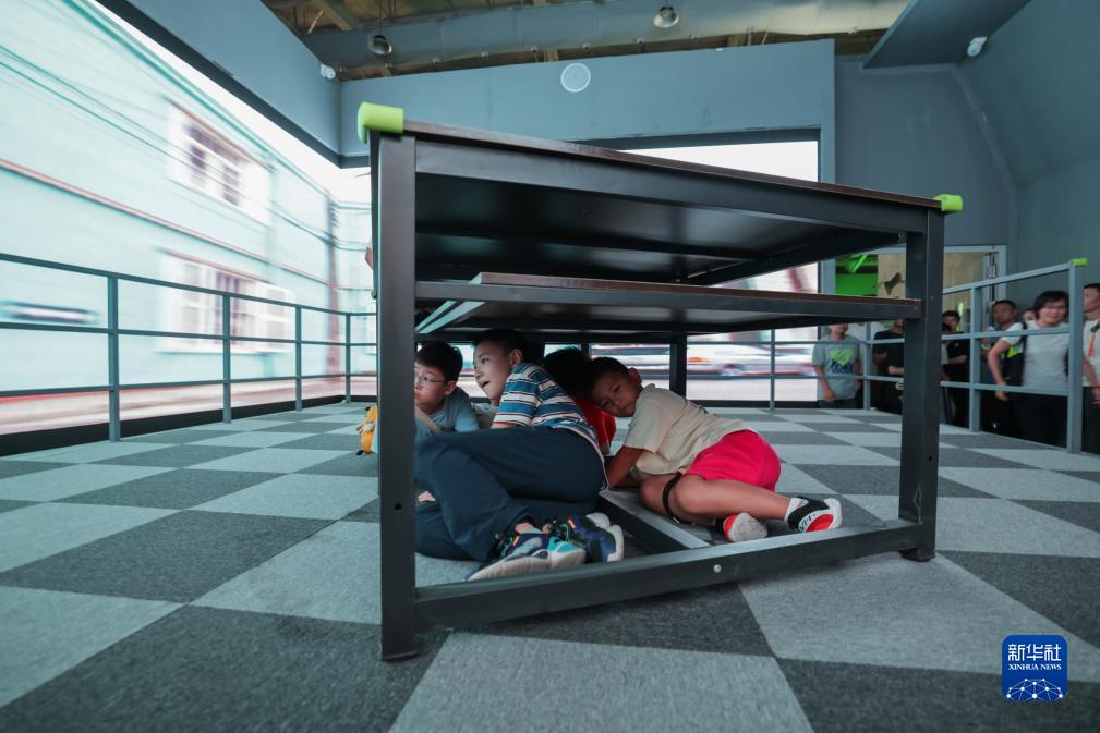 9月3日,小朋友在首钢园内进行模拟地震体验。新华社记者 张玉薇 摄