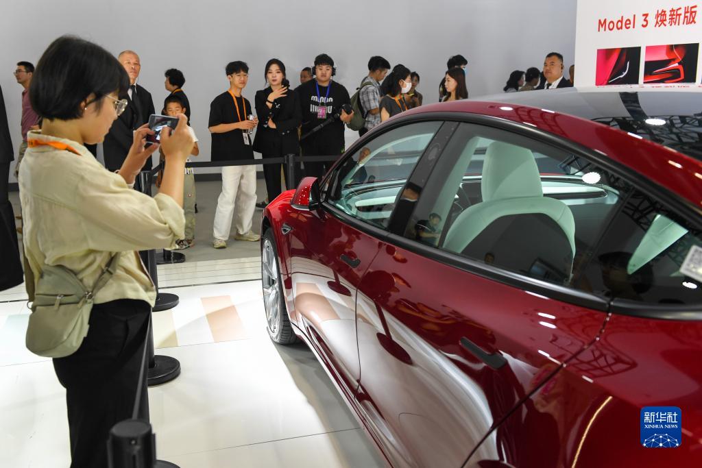 9月3日,在国家会议中心的特斯拉公司展台,参观者在了解特斯拉展出的新款电动车。新华社记者 鞠焕宗 摄