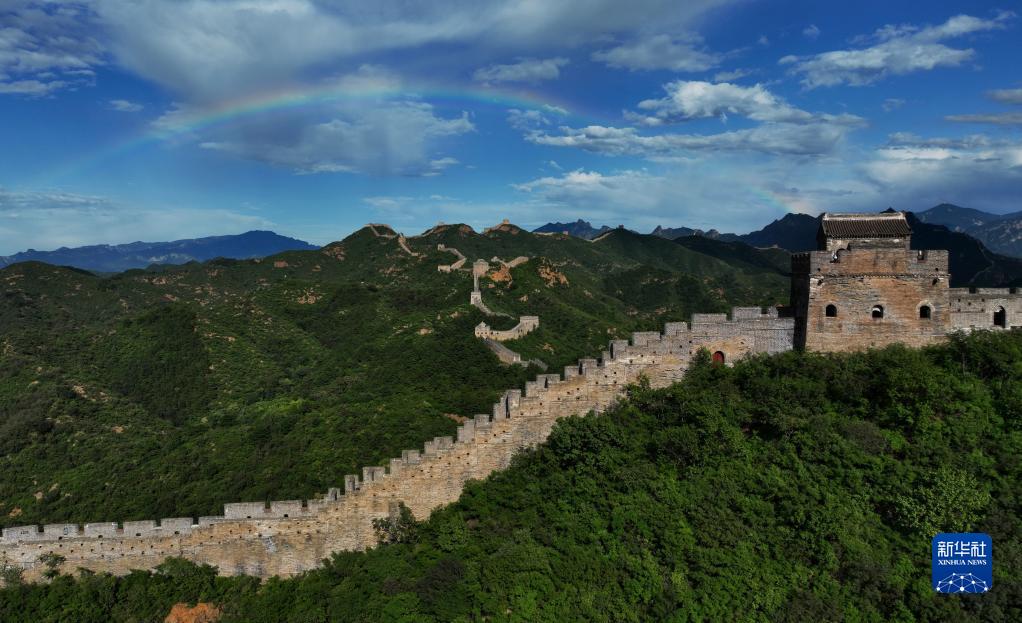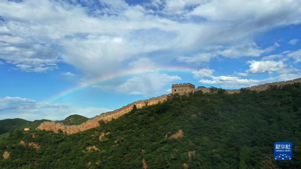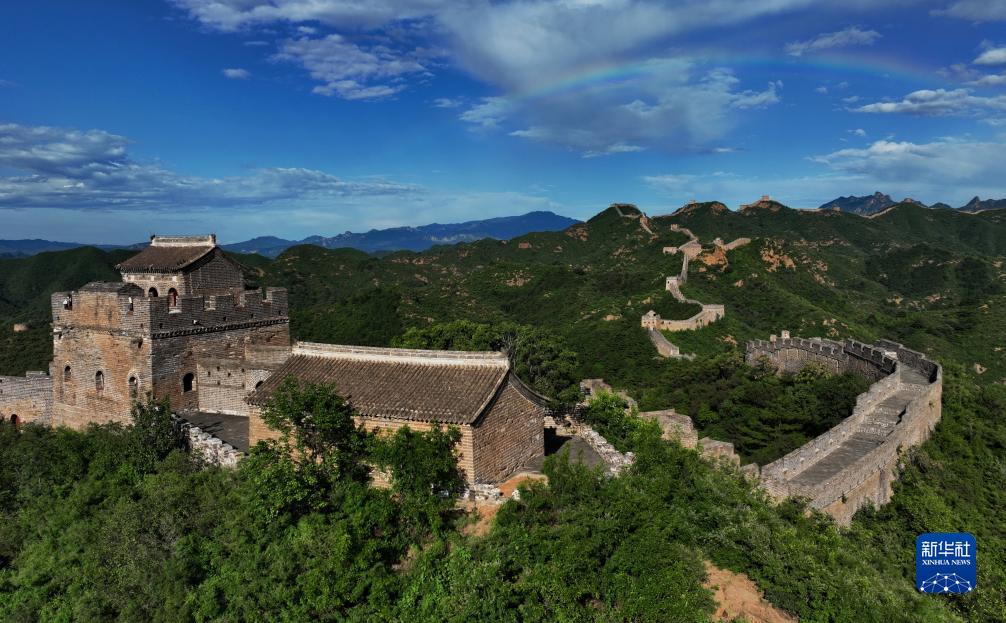 一场雷阵雨过后,金山岭长城出现彩虹景观(8月31日摄,无人机照片)。新华社记者 陈斌 摄
