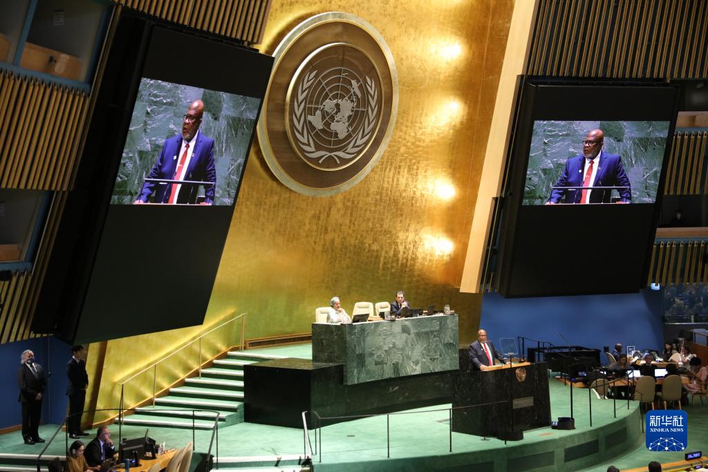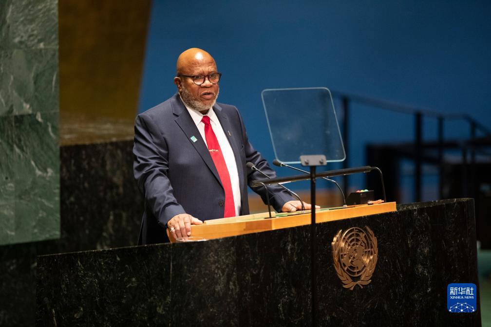 9月5日,在位于纽约的联合国总部,第78届联合国大会主席丹尼斯·弗朗西斯在新一届联大第一次全会上致辞。新华社记者谢锷摄