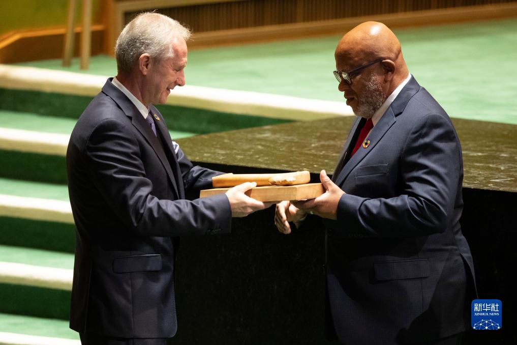 9月5日,在位于纽约的联合国总部,第78届联合国大会主席丹尼斯·弗朗西斯(右)从第77届联合国大会主席克勒希手中接过象征联大主席权力的木槌。新华社记者谢锷摄