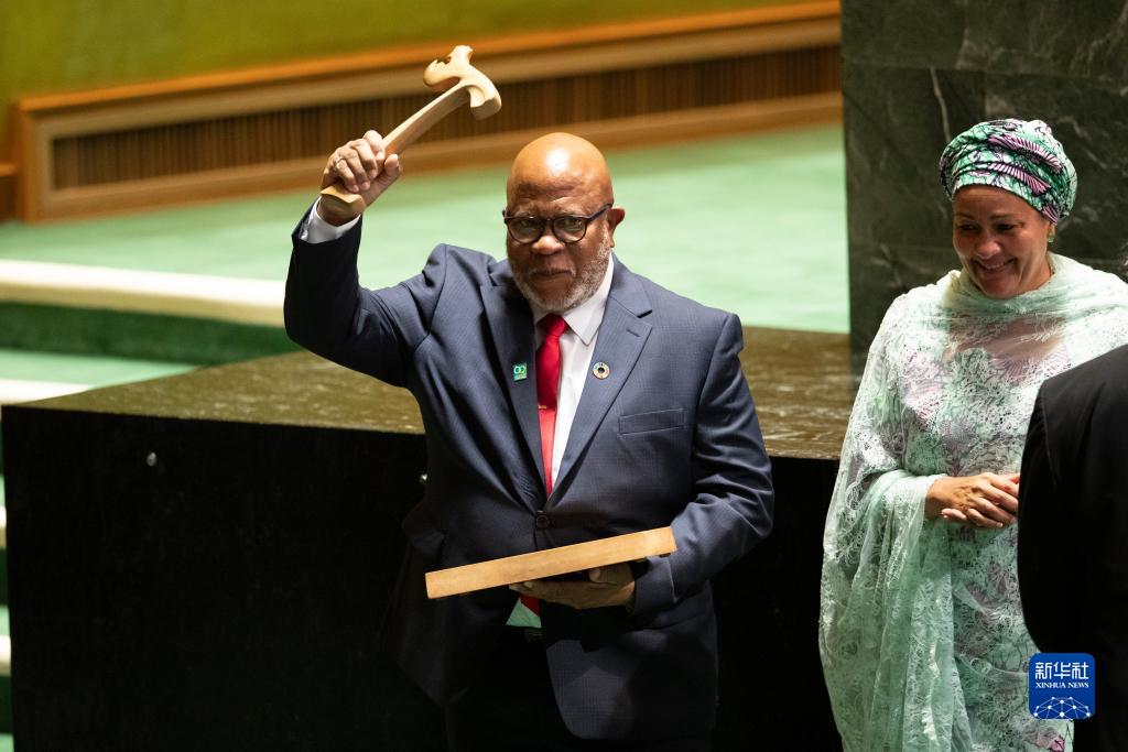 9月5日,在位于纽约的联合国总部,第78届联合国大会主席丹尼斯·弗朗西斯(左)举起象征联大主席权力的木槌。新华社记者谢锷摄