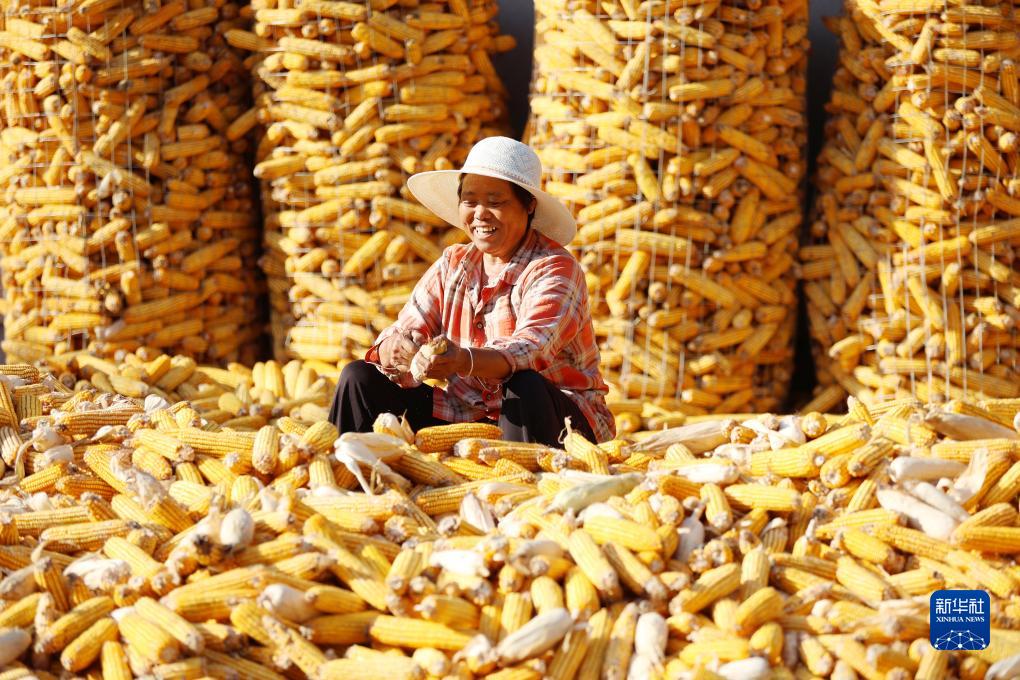 9月14日,山东省临沂市郯城县郯城街道南泉村村民在整理收获的玉米。新华社发(张春雷 摄)