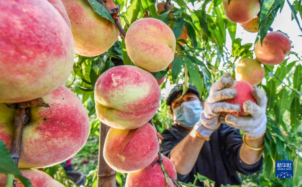 9月11日,河北省遵化市东旧寨镇五虎岭村农民在采摘鲜桃。新华社发(刘满仓 摄)
