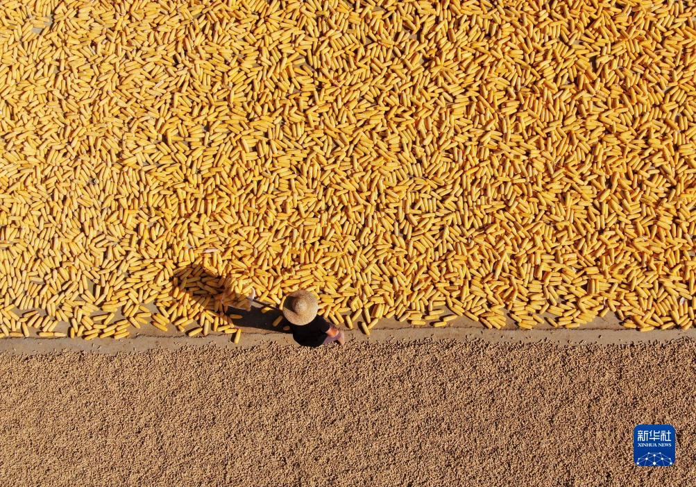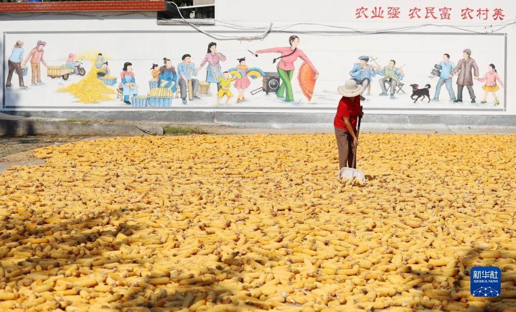 9月14日,山东省临沂市郯城县郯城街道东南村村民在晾晒收获的玉米。新华社发(张春雷 摄)