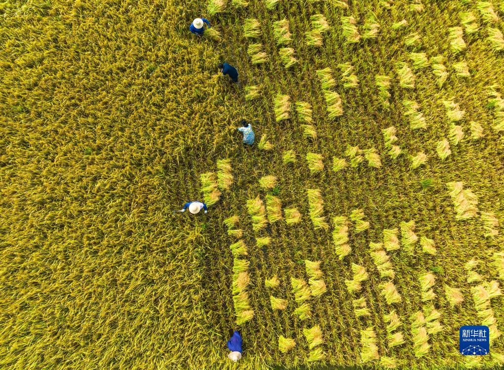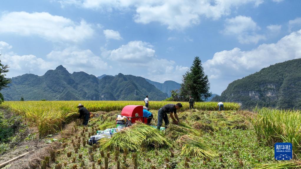 9月14日,村民在贵州省黔东南苗族侗族自治州岑巩县天星乡天星村收获水稻(无人机照片)。新华社发(胡攀学 摄)