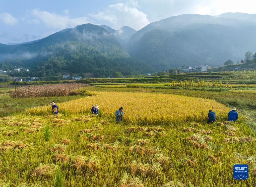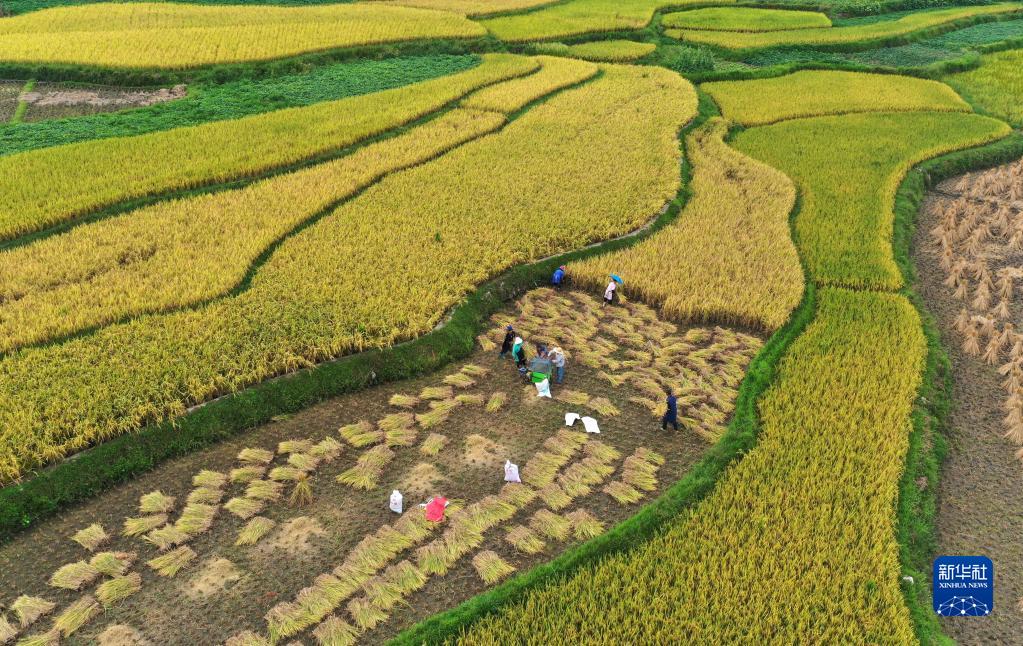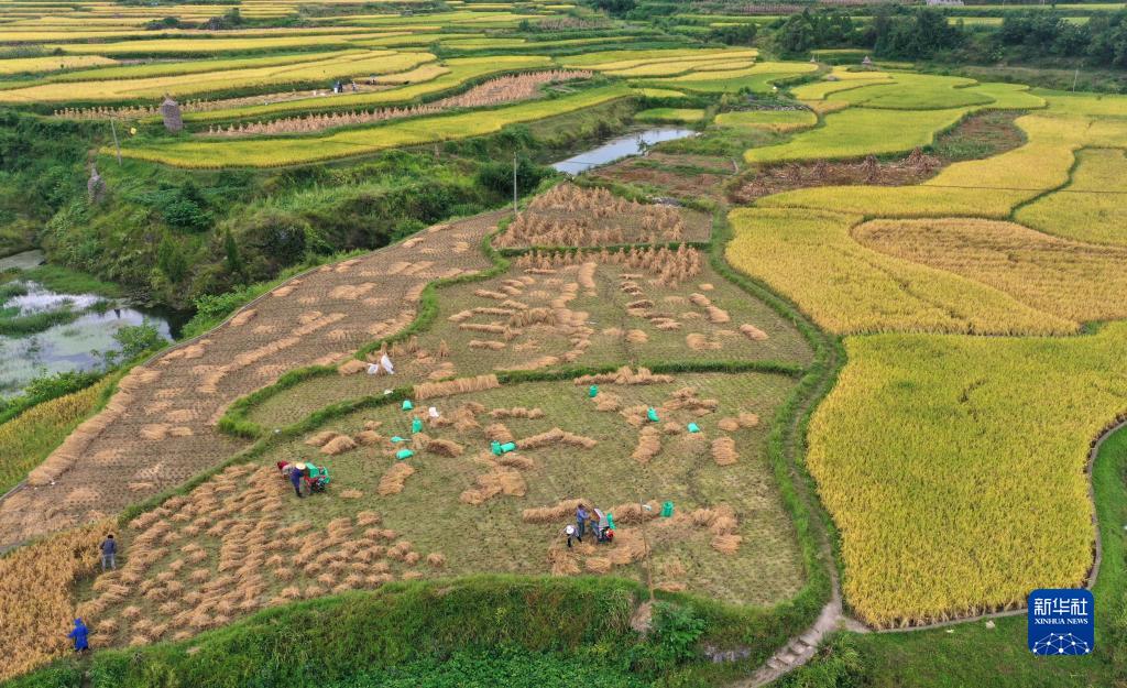 9月14日,湖北省秭归县九畹溪镇石柱村村民在田间收获稻谷(无人机照片)。新华社发(王罡 摄)