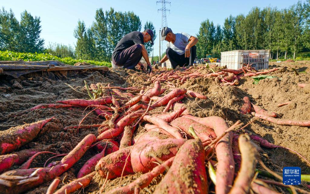 9月14日,河北省唐山市海港经济开发区王滩镇农民在田间收获红薯。新华社发(李磊 摄)