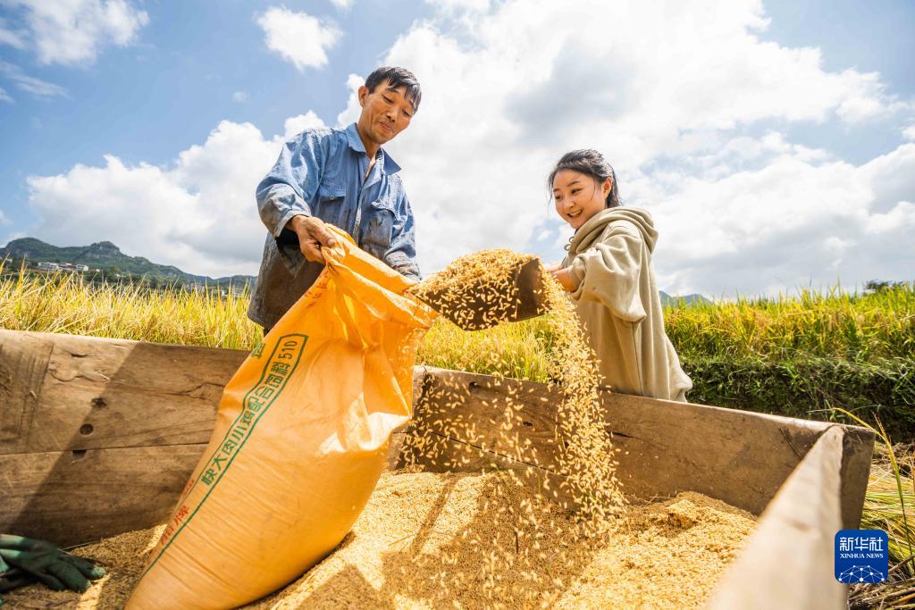 9月14日,村民在贵州省毕节市大方县小屯乡小屯梯田里收集脱粒的稻谷。新华社发(罗大富 摄)
