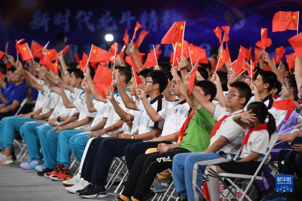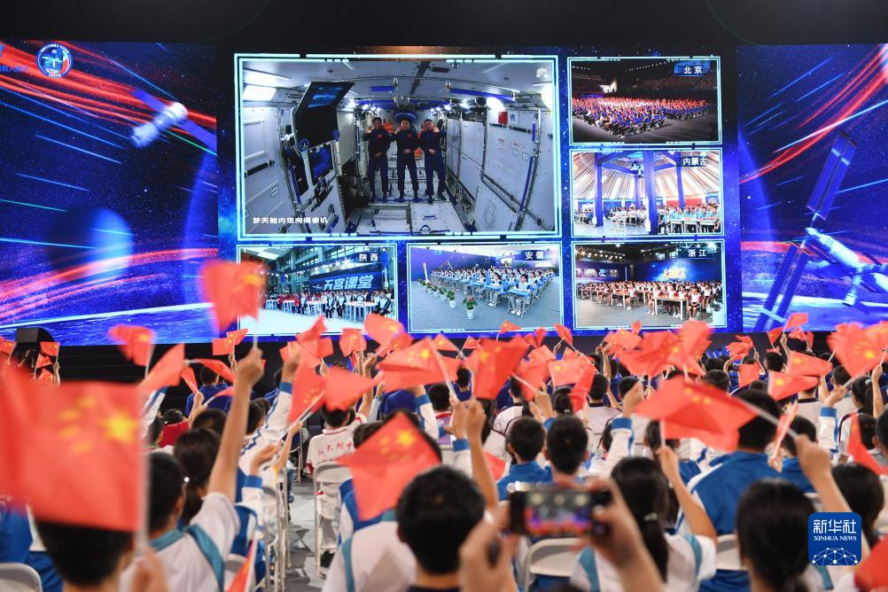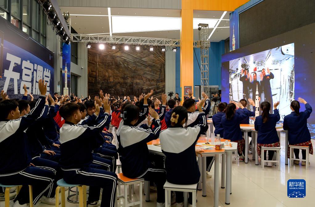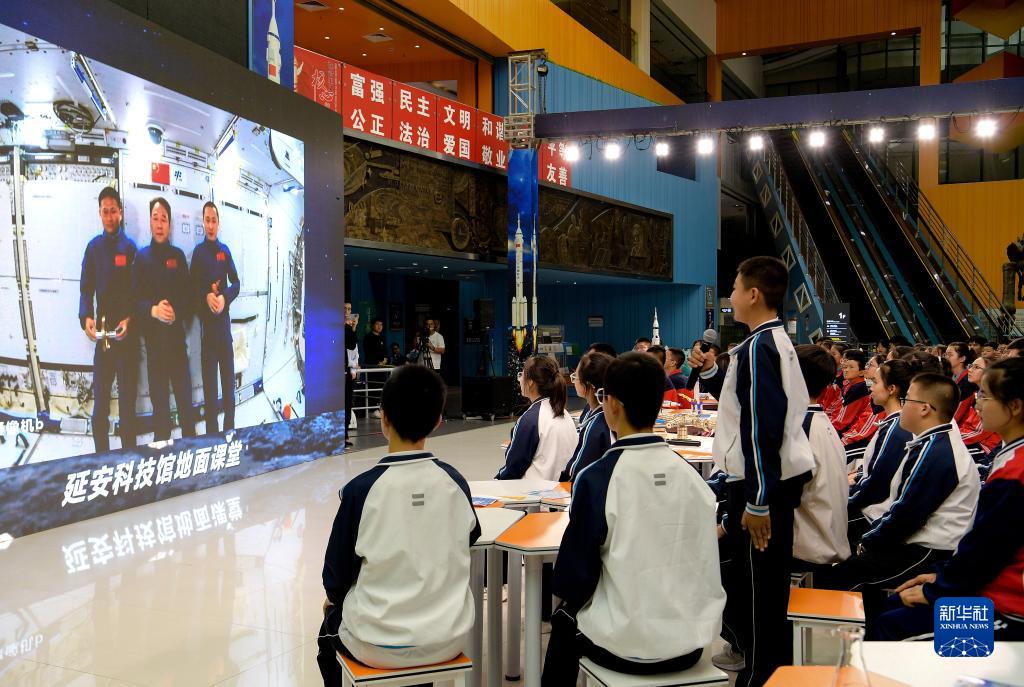 9月21日,在陕西延安科技馆“天宫课堂”第四课地面课堂,学生在向航天员提问。新华社发(邓志宏 摄)