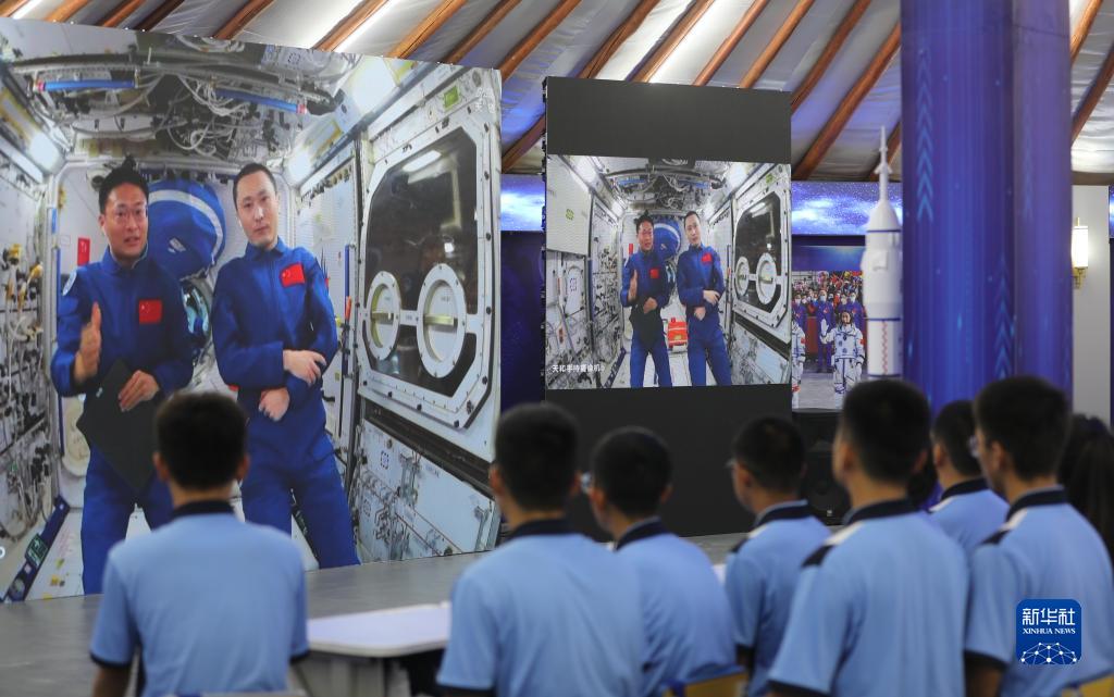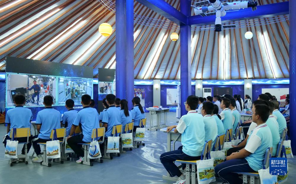 9月21日,在内蒙古阿拉善盟额济纳旗,学生收看“天宫课堂”。新华社发(敖琪 摄)