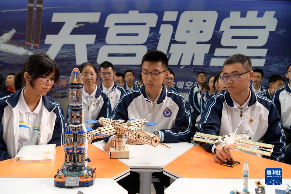 9月21日,在陕西延安科技馆“天宫课堂”第四课地面课堂,学生在了解航天模型。新华社发(邓志宏 摄)
