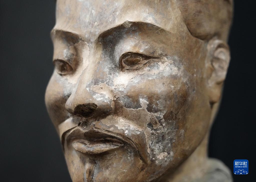 在秦始皇帝陵博物院文物保护部彩色陶俑修复室内,一尊秦俑脸部尚存部分彩绘层。秦俑五官的精准塑造显示出秦代匠人具有高超的写实能力(8月23日摄)。新华社记者 李贺 摄