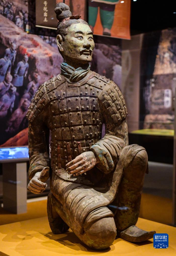 一尊出土的彩绘绿面跪射俑在首都博物馆展出(2021年5月18日摄)。新华社记者 李贺 摄