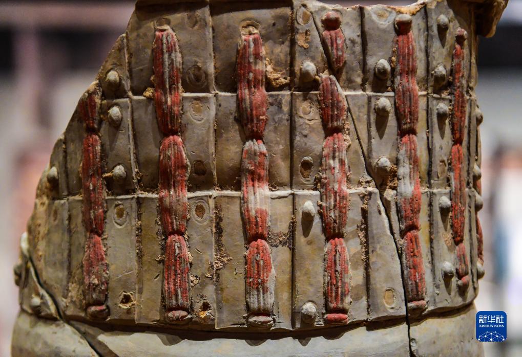 一尊出土的彩绘秦俑铠甲残块在首都博物馆展出(2021年5月18日摄)。新华社记者 李贺 摄