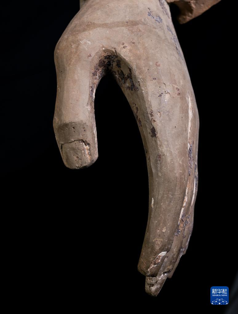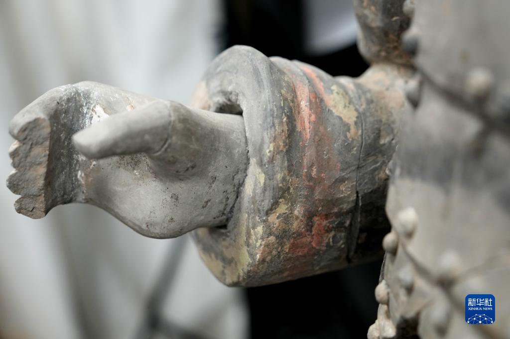 在秦始皇帝陵博物院文物保护部彩色陶俑修复室内,一尊秦俑的手部特写显示出丰富的细节(8月23日摄)。新华社记者 李贺 摄
