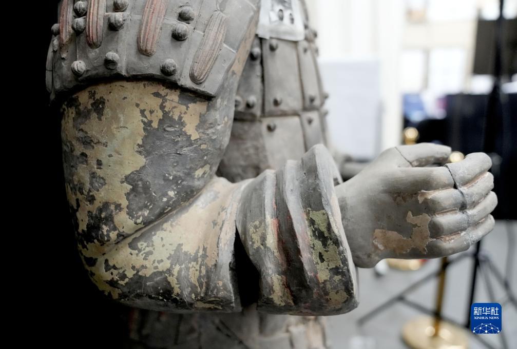 这是秦俑衣袖上的彩绘还原修复后的样貌(8月23日摄)。新华社记者 王毓国 摄