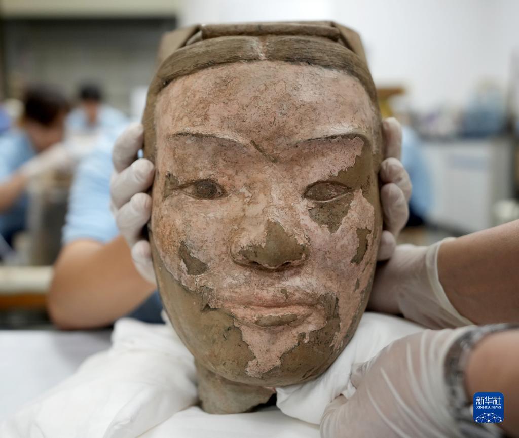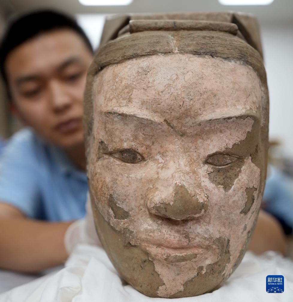 在秦始皇帝陵博物院文物保护部彩色陶俑修复室内,一尊秦俑脸部尚存部分彩绘层(8月23日摄)。新华社记者 张博文 摄