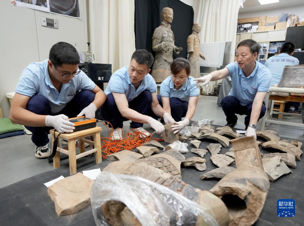 秦始皇帝陵博物院文物修复专家兰德省(右一)在指导技术人员运用超声波仪器测量秦俑胎体的密度(8月23日摄)。新华社记者 王毓国 摄