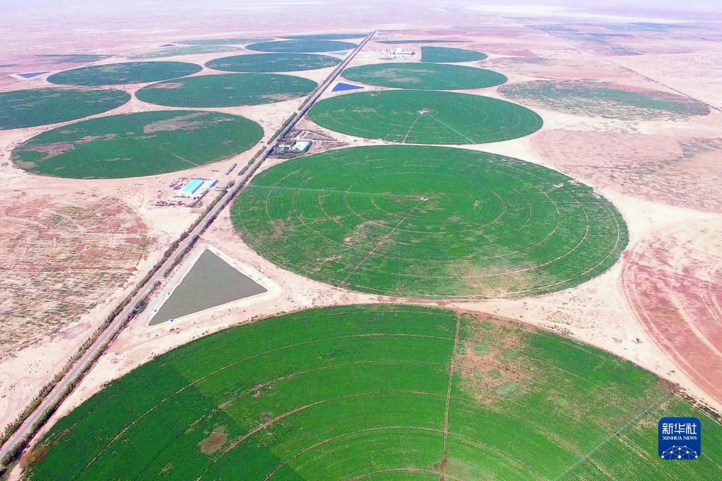 这是8月28日拍摄的内蒙古乌兰布和沙漠苜蓿种植基地(无人机照片)。新华社记者 李云平 摄