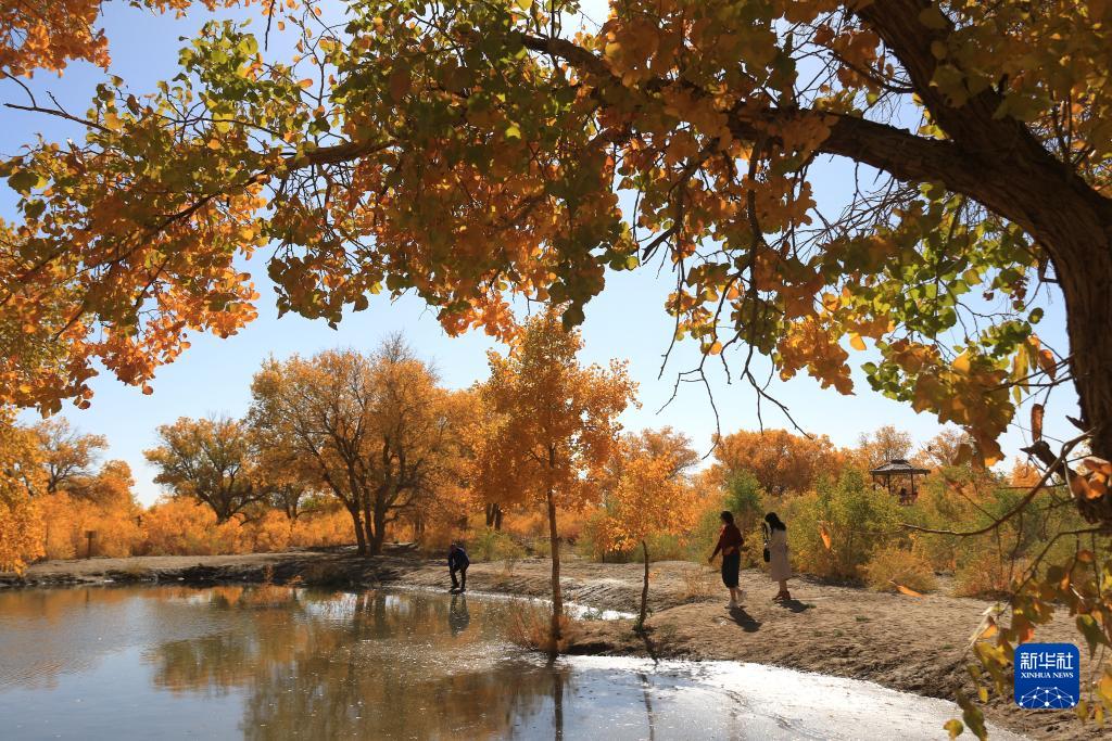 10月14日,游客在甘肃省敦煌市黄渠镇胡杨林中赏景。新华社发(张晓亮摄)