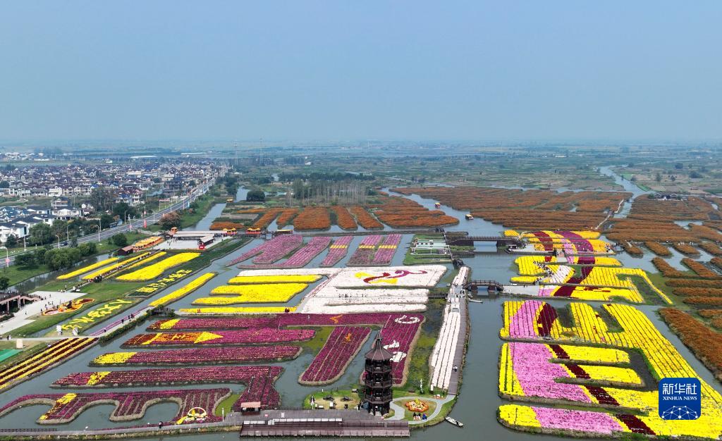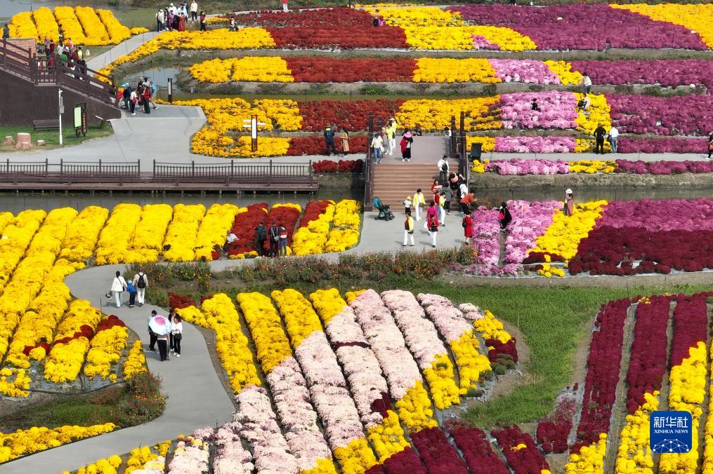 10月14日,游客在江苏省兴化市千垛景区赏菊游玩(无人机照片)。新华社发(孟德龙 摄)