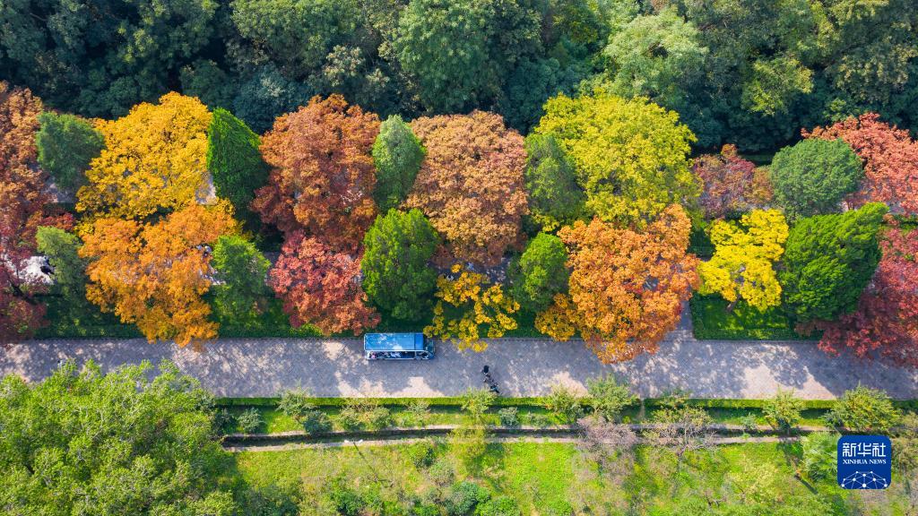 10月14日拍摄的南京明孝陵景区石象路秋景(无人机照片)。新华社发(苏阳 摄)