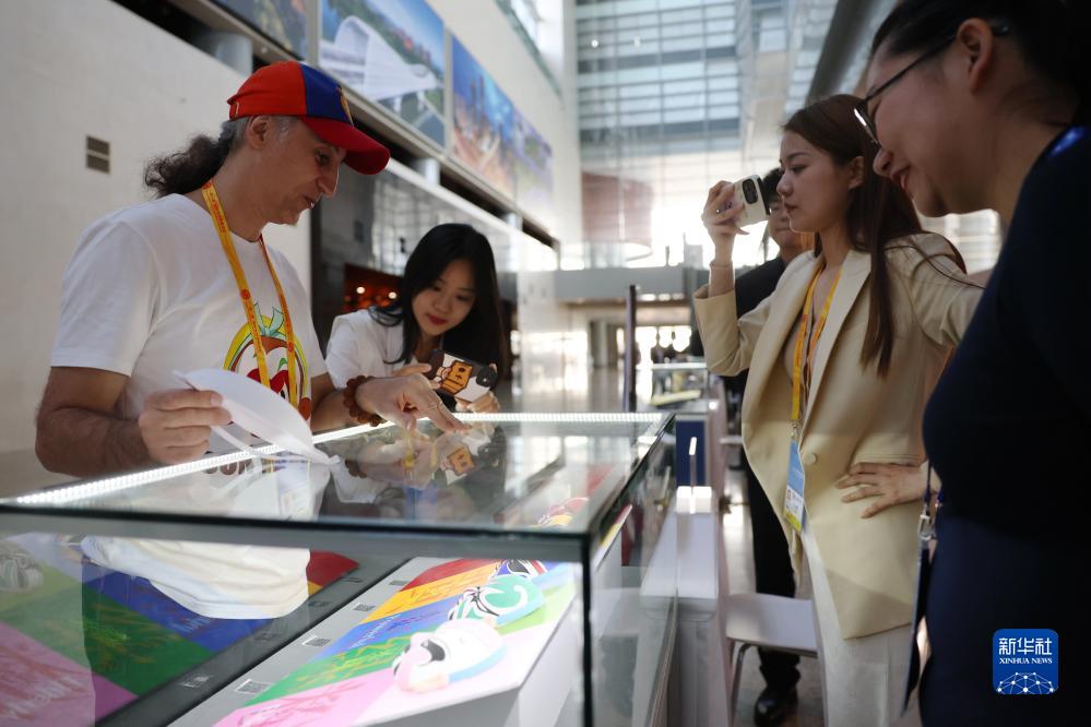 10月16日,参会记者在“一带一路”国际合作高峰论坛新闻中心参观展示的中国非物质文化遗产展品。新华社记者 陈斌 摄